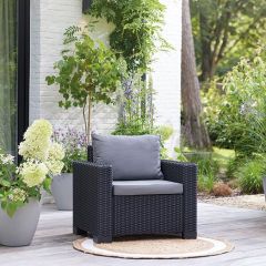 С ранних утренних часов до позднего ночного времени Вы можете отдыхать и расслабляться в комфортном кресле Калифорния. Стильная текстура, имитирующая ротанговое плетение, исключительно широкие подлокотники, подушки сиденья и спинки - благодаря им это кресло идеально подходит для того, чтобы отдыхать в летний день. А поскольку оно изготовлено из устойчивого к погодным условиям пластика с защитой от ультрафиолетового излучения, Вы будете им наслаждаться на протяжении многих сезонов, не заботясь об уходе.
