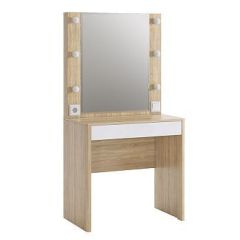 В зеркало с широким фацетом, встроена подсветка c 6 лампочками (приобретаются отдельно), как в столах профессиональных визажистов. Дополнительно имеется выключатель, розетка для фена и выдвижной ящик для украшений и косметики.